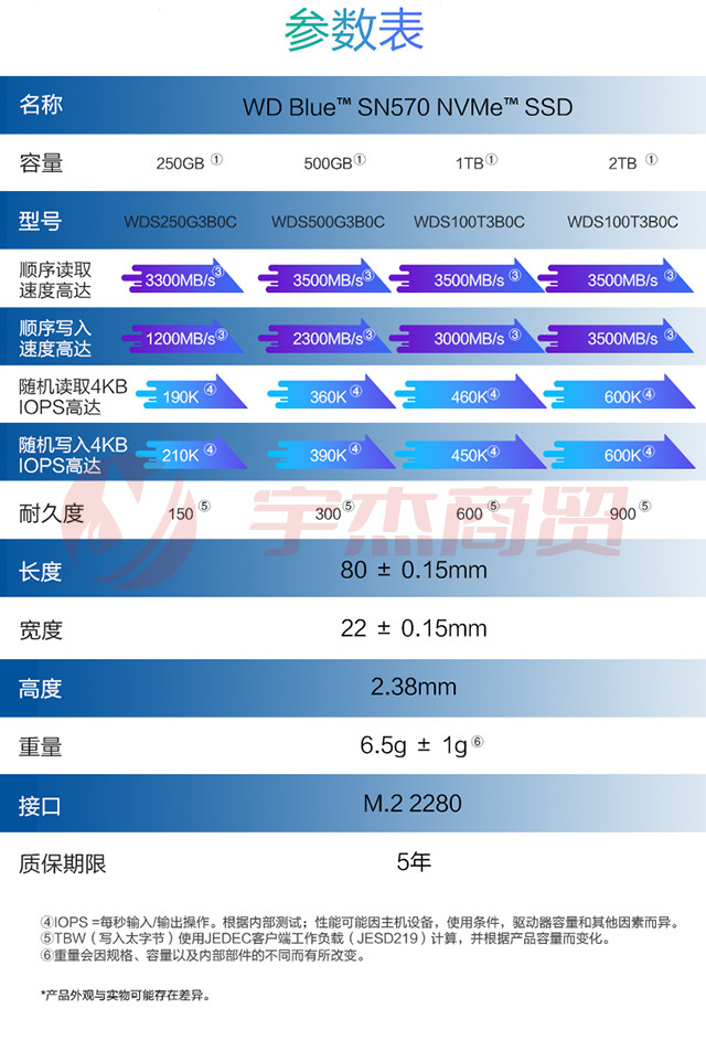 西部数据(Western Digital)250GB SSD固态硬盘 M.2接口(NVMe协议) WD Blue SN570 四通道PCIe 高速