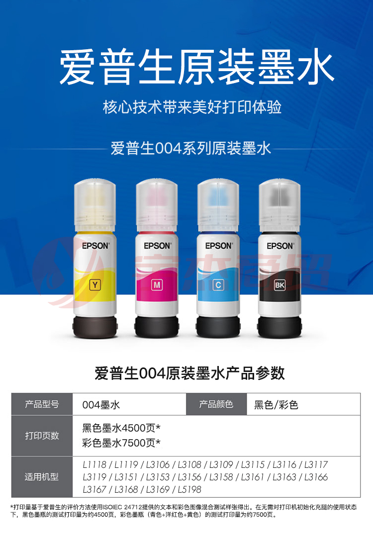 爱普生004墨水原装适用L3153 L3116L3117L3118L3119L3158L1118 四只装(1黑3彩色) 原装 自营